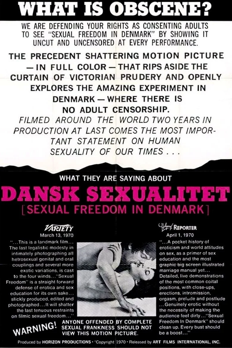 Starting as a documentary on the sexually liberated culture of late-Sixties Denmark, Sexual Freedom in Denmark winds up incorporating major elements of the marriage manual form and even manages to squeeze in a montage of beaver loops and erotic art.Other alternative titles: Sensual Freedom in Denmark; Dansk sexualitet; Love and Sexual Freedom